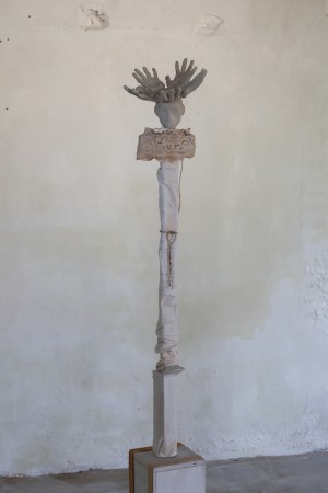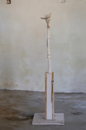 unique piece, concrete, steel, stocking, calico, wood, paint 170 x 55 x 50 cm