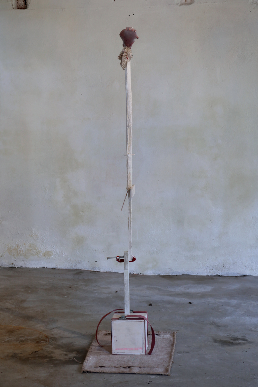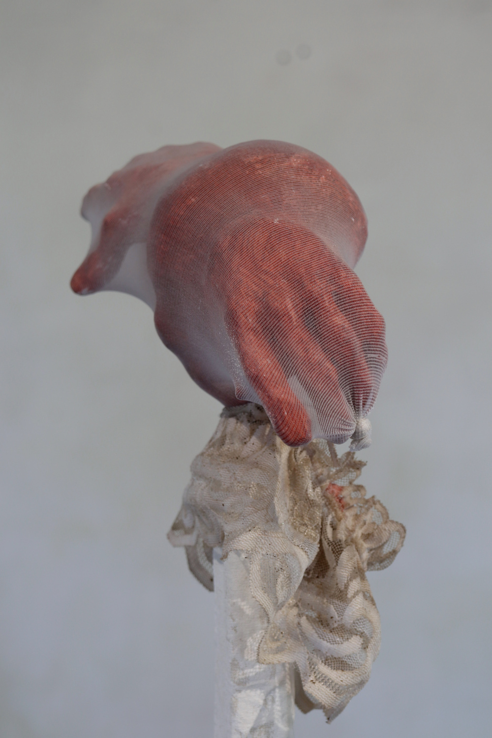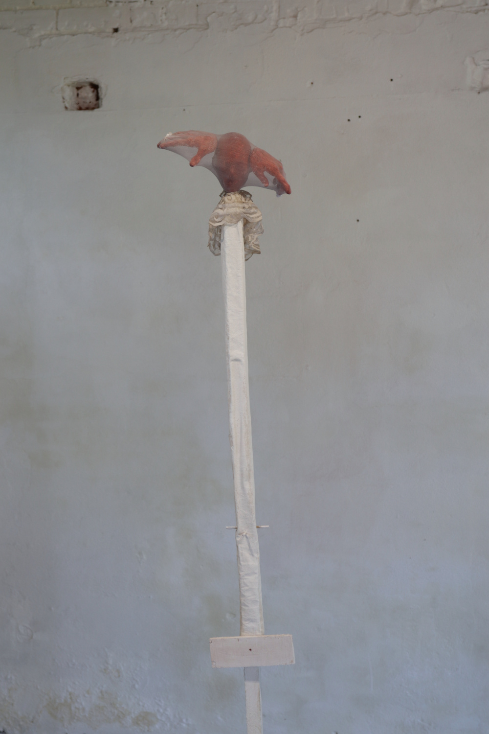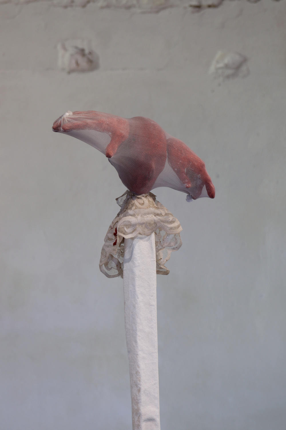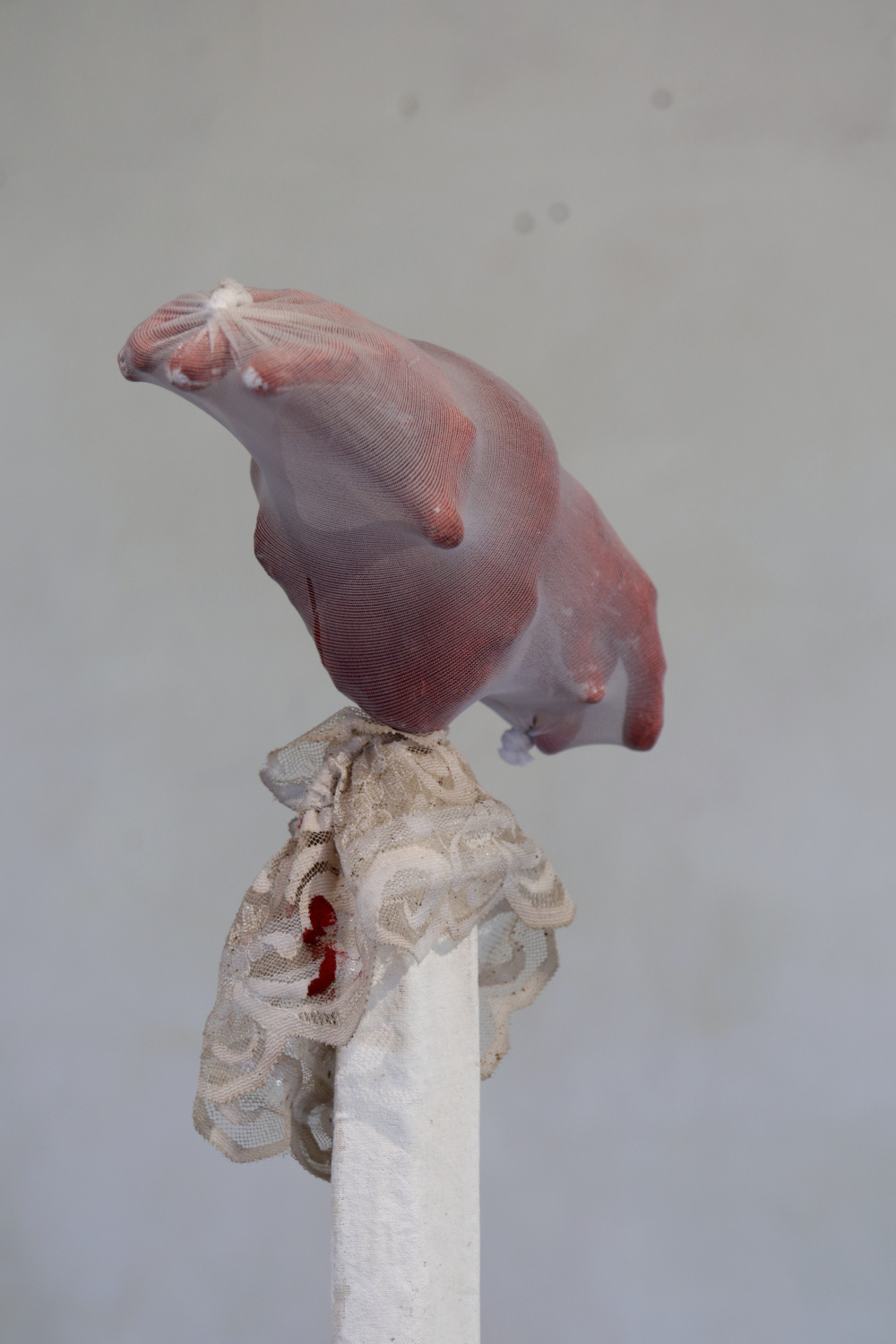 unique piece, concrete, steel, stocking, calico, polymer clay, wood, paint 175 x 95 x 50 cm